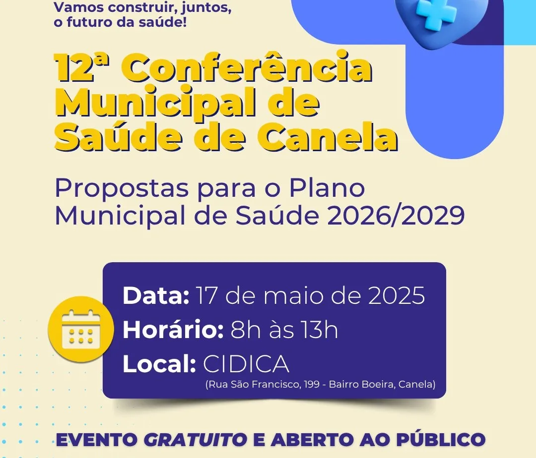 A Secretaria Municipal de Saúde de Canela e o Conselho Municipal de Saúde promovem neste sábado, dia 17, a 12ª Conferência Municipal de Saúde, com a finalidade de discutir as propostas que irão compor o Plano Municipal de Saúde para o período 2026/2029. O evento será realizado no Centro Integrado de Desenvolvimento e Inovação (Cidica), das 8h às 13h, e toda a comunidade é convidada a participar. As inscrições serão feitas na hora.