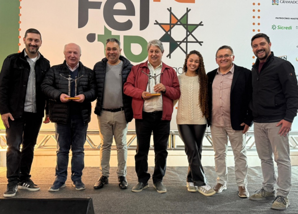Um dos momentos mais emocionantes da cerimônia foi a entrega do troféu “Homens que abraçam”, criado pelo artista Bino Ferreira. A homenagem foi dedicada pelo secretário André Castilhos e equipe da Inovação ao prefeito Nestor Tissot e ao vice-prefeito Luia Barbacovi, idealizadores da feira. Bino, que participou das primeiras edições do evento, demonstrou sua gratidão. “Estive nas primeiras edições da feira e aqui me tornei conhecido. Hoje minha demanda é tão grande que não consigo mais participar do evento, mas agradeço imensamente por essa oportunidade que a Administração Municipal proporcionou a mim e a tantos outros expositores ao longo destes anos”.