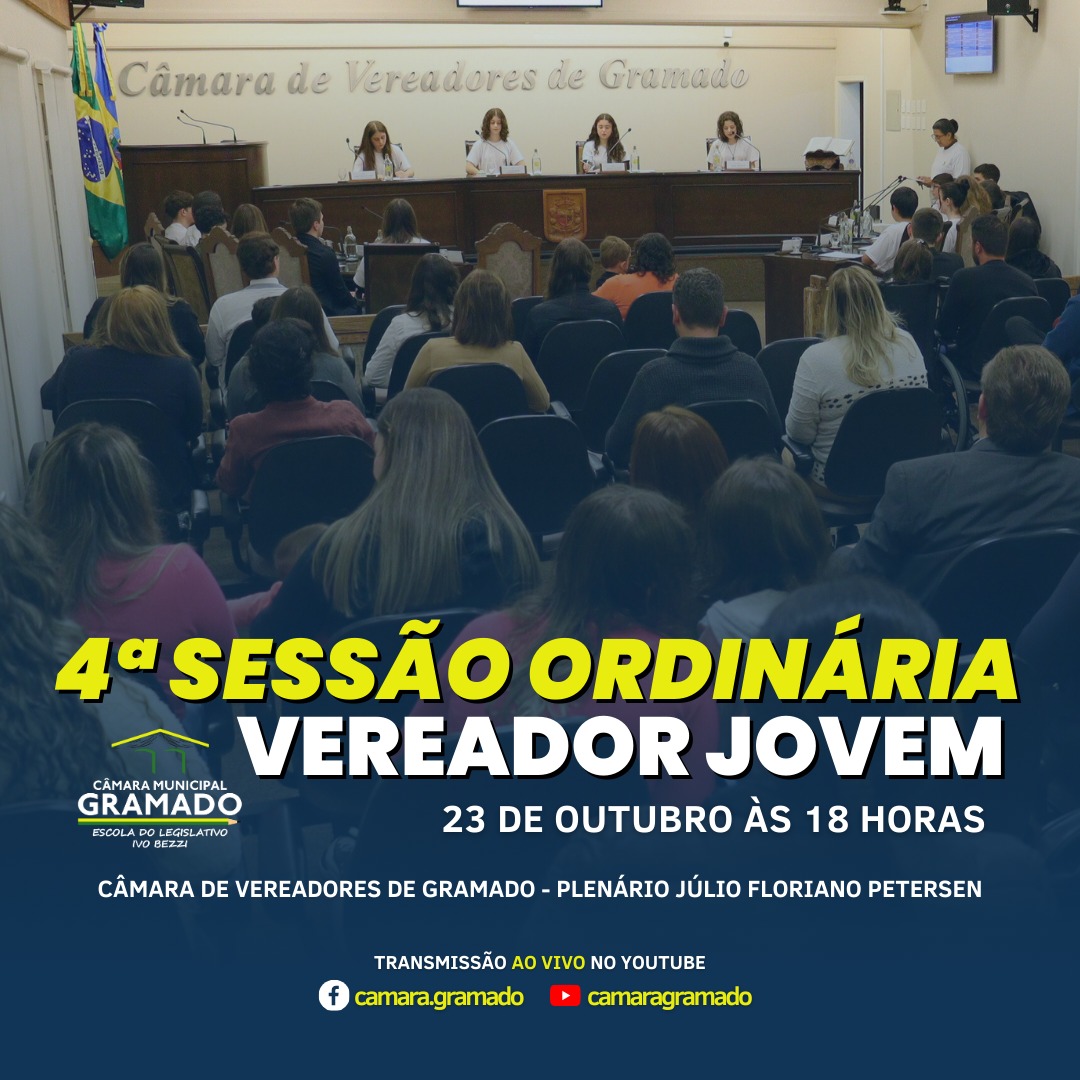 No próximo dia 23 de outubro, às 18 horas, acontecerá no plenário Júlio Floriano Petersen a 4ª sessão ordinária do Parlamento Jovem, programa da Escola do Legislativo Ivo Bezzi da Câmara de Vereadores de Gramado. Durante a sessão, os jovens parlamentares terão a oportunidade de apresentar, mais uma vez, suas proposições voltadas para melhorias em suas escolas e na comunidade onde residem.