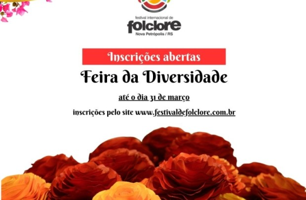 A Secretaria Municipal de Turismo e Cultura de Nova Petrópolis comunica a abertura do período de inscrições para a Feira da Diversidade do 53º Festival Internacional de Folclore. O evento é destinado a expositores que preservem e incentivem o folclore e a arte popular por meio de trabalhos manuais e da preservação cultural.