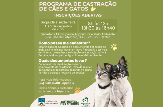 Estão abertas as inscrições para o Programa de Esterilização de Caninos e Felinos de Nova Petrópolis. As inscrições ocorrem mediante preenchimento da ficha de inscrição e entrega de documentos na Secretaria Municipal de Agricultura e Meio Ambiente, na sede da Prefeitura Municipal. As inscrições ocorrem de segunda a sexta-feira, das 8h às 12h e das 13h30 às 16h40, até o dia 5 de dezembro de 2025, podendo encerrar antes desta data, conforme a disponibilidade de recursos. Podem se inscrever tutores, protetores de animais e/ou entidades não governamentais de proteção animal legalmente instituídas e residentes em Nova Petrópolis. Além de castrados, os animais também serão microchipados.