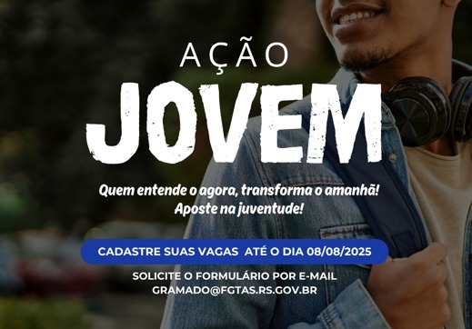 A Ação Jovem 2025 será realizada no dia 15 de agosto de 2025, das 13h30 às 16h30, na Agência FGTAS/SINE de Gramado, na Av. das Hortênsias, 2029 – Centro. O evento acontece em alusão à Semana Estadual da Juventude no Rio Grande do Sul, instituída pela Lei 14.723/2015, que tem como objetivo primordial fortalecer a inserção do jovem no mundo do trabalho.