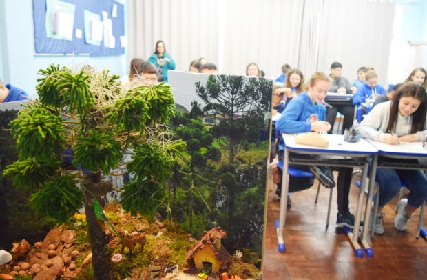 Acompanhada das técnicas da Secretaria de Agricultura e Meio Ambiente do Município, Evelyn Dinnerbier e Cássia Hoffmann, a palestrante mostrou aos alunos uma maquete em que estava demonstrada a floresta de araucária, a qual se referiu durante a apresentação. Com isso, mostrou animais que tem nessa árvore sua subsistência (como a gralha azul, a aranha caranguejeira, o macaco bugio e o grimpeirinho), e falou sobre o período do defeso em que é proibido seu corte e também a partir de quando é permitida a coleta das sementes – que são os pinhões.