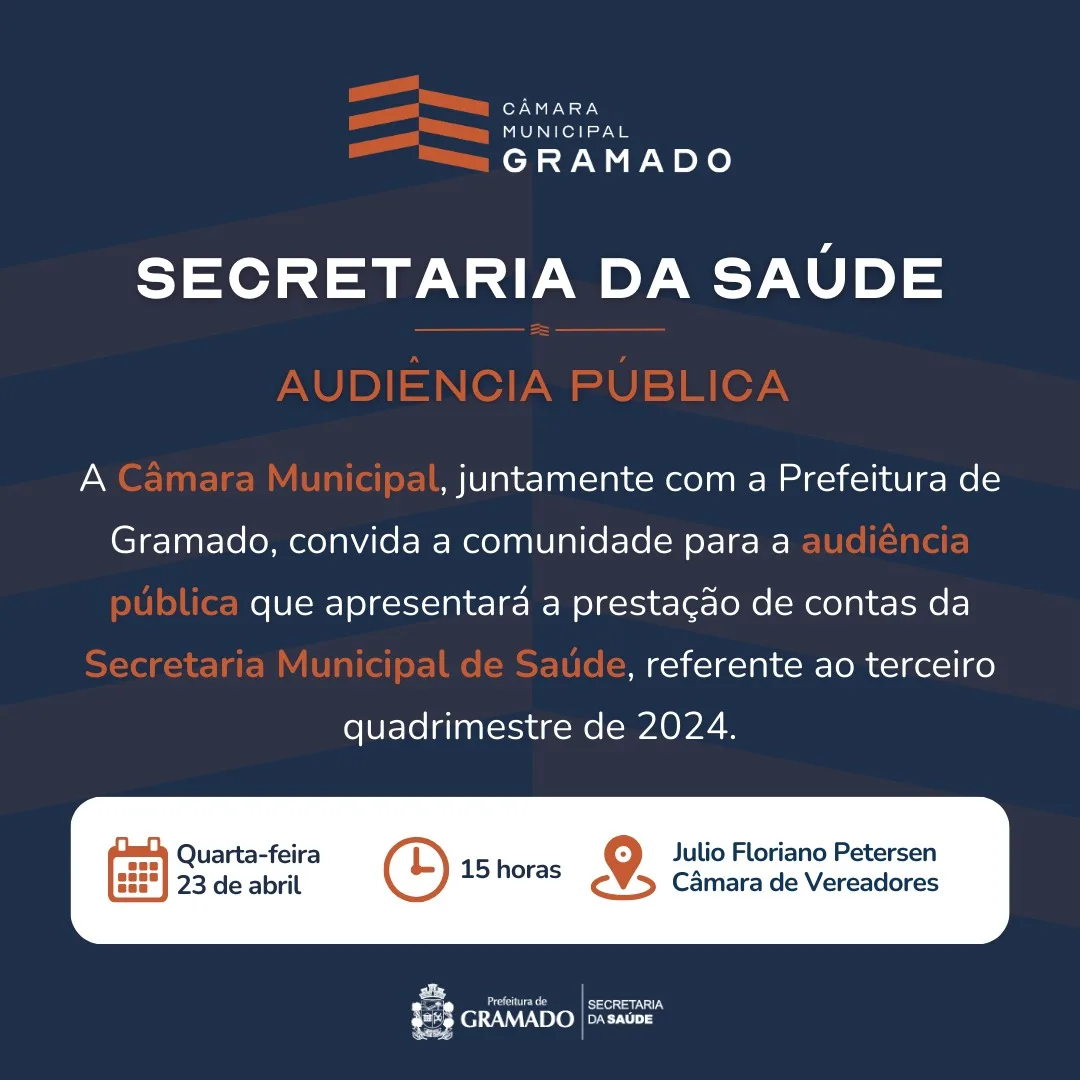 A Câmara Municipal de Gramado, em parceria com a Prefeitura, promove na próxima quarta-feira, dia 23 de abril, às 15h, uma Audiência Pública para apresentação da prestação de contas da Secretaria Municipal da Saúde, referente ao terceiro quadrimestre de 2024.