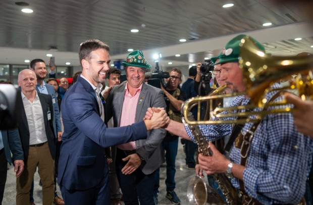 Um dos momentos mais festejados do Rio Grande do Sul, a reabertura do aeroporto Salgado Filho para voos foi acompanhada por música de uma bandinha típica de Nova Petrópolis na manhã desta segunda-feira, 21 de outubro. Uma comitiva do Município esteve em Porto Alegre durante a manhã acompanhando a volta do tráfego aéreo, que estava interrompido desde o início de maio em função das enchentes.
