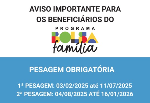 Já está em vigor o período para a 1ª Pesagem do Programa Bolsa Família 2025, condição obrigatória para que as famílias cadastradas continuem a receber o benefício. A pesagem deve ser realizada na Unidade de Saúde de referência do beneficiário e o prazo é 11 de julho. Ela é obrigatória para as crianças menores de 7 anos, mulheres com idade entre 14 e 44 anos e gestantes.