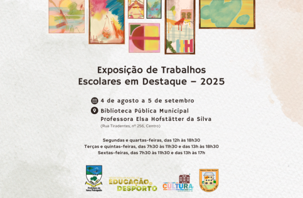 A partir de segunda-feira, dia 4 de agosto, a comunidade de Nova Petrópolis poderá prestigiar a Exposição de Trabalhos Escolares em Destaque – 2025, uma mostra especial que permanecerá aberta até 5 de setembro, na Biblioteca Pública Municipal Professora Elsa Hofstätter da Silva, localizada na Rua Tiradentes, nº 256, Centro.