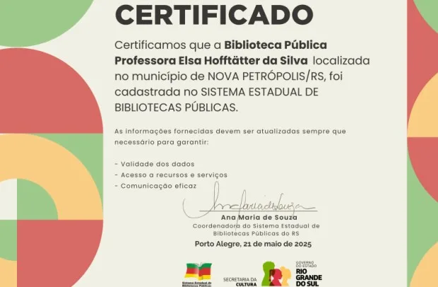 A Biblioteca Pública Municipal Professora Elsa Hofstätter da Silva, de Nova Petrópolis, está integrada ao Sistema Estadual de Bibliotecas Públicas do Rio Grande do Sul (SEBP). A certificação, concedida pelo Governo do Estado, reconhece o compromisso da instituição com a promoção da leitura, da cultura e do acesso à informação para toda a comunidade.