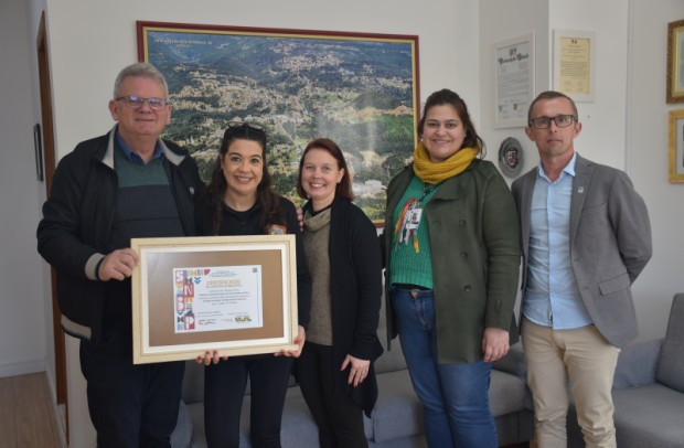 Para registrar o reconhecimento do Ministério da Cultura, o prefeito de Nova Petrópolis, Daniel Carlos Michaelsen; a secretária Municipal de Educação e Desporto, Caroline Andréia Kehl Matter; o secretário Municipal de Administração, Paulo Marcos Schwantz; a diretora do Departamento Municipal da Cultura, Iasmin Schmitt; e a bibliotecária de Nova Petrópolis, Susana Carrasco, registraram, nesta terça-feira, 8 de julho, uma foto com o certificado no Gabinete Oficial. O ato simbólico reforça o apoio da Administração Municipal à valorização da leitura e da cultura.
