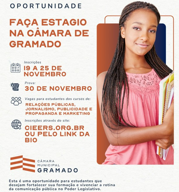 A Câmara Municipal de Gramado, por meio do Gabinete da Presidência, tornou público nesta quarta-feira (19) o processo seletivo para contratação de estagiário de nível superior. A instituição está oferecendo uma vaga, além de cadastro reserva, destinada a estudantes matriculados a partir do segundo semestre dos cursos da área de Comunicação Social, como Relações Públicas, Jornalismo, Publicidade e Propaganda e Marketing.