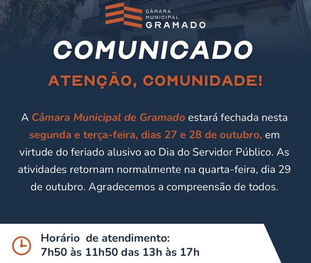 A Câmara Municipal de Gramado informa que, conforme o Decreto Legislativo nº 01/2025, que define os feriados e pontos facultativos do Legislativo gramadense, a Casa do Povo estará fechada na próxima segunda e terça-feira, em razão da comemoração do Dia do Servidor Público, celebrado em 28 de outubro.