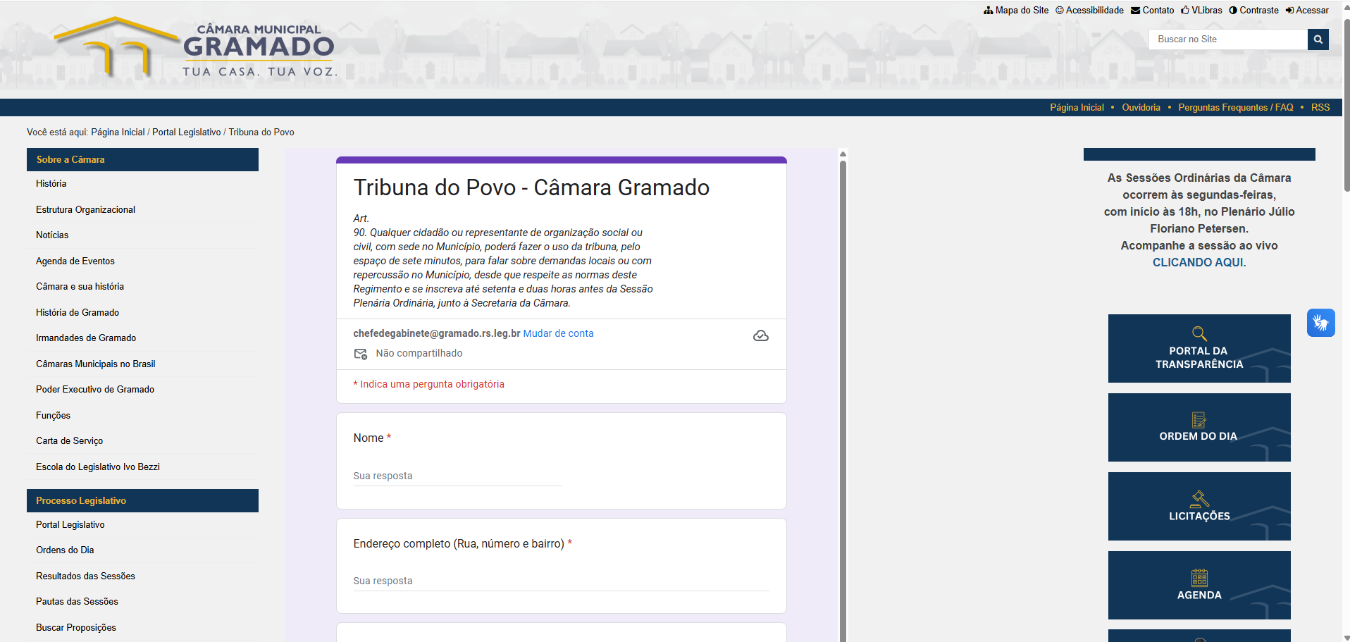 Os interessados podem se inscrever pelo link: https://www.gramado.rs.leg.br/processo-legislativo/tribuna-do-povo.