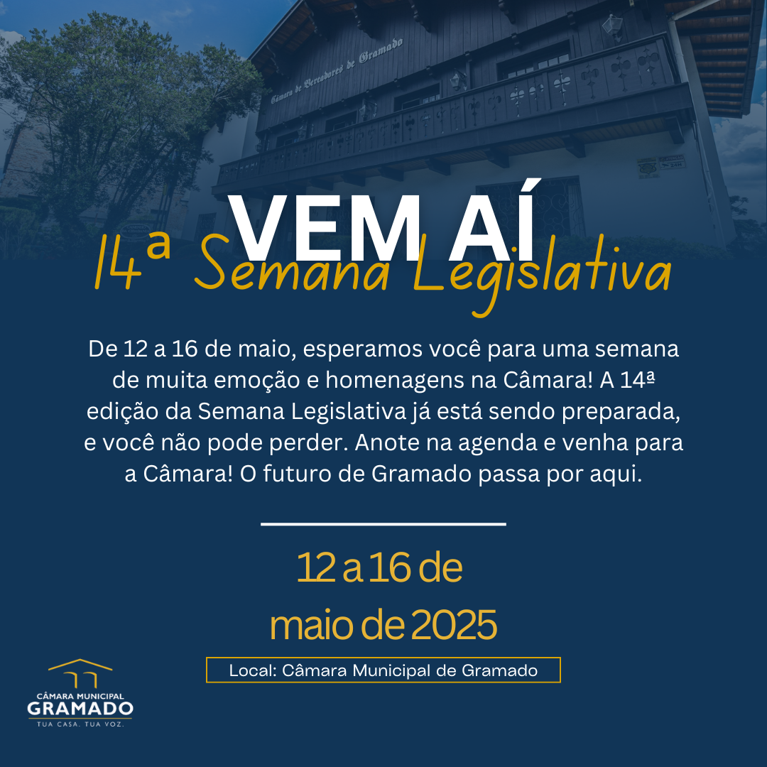 A 14ª Semana Legislativa da Câmara de Gramado está chegando! Como já é tradição, o evento acontecerá em maio, entre os dias 12 e 16, e será marcado por homenagens a cidadãos notáveis do município.