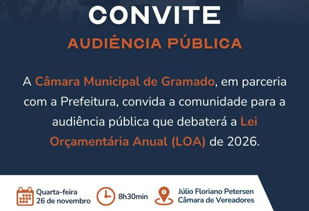 A Lei Orçamentária Anual (LOA) de Gramado estará em debate na Câmara Municipal nesta quarta-feira, dia 26, a partir das 8h30. A LOA é o instrumento que detalha todas as receitas e despesas do município, funcionando como o orçamento oficial da Prefeitura. É nela que se estabelece quanto o governo local espera arrecadar e de que forma esses recursos serão aplicados nas mais diversas áreas, como saúde, educação, obras, turismo e assistência social.