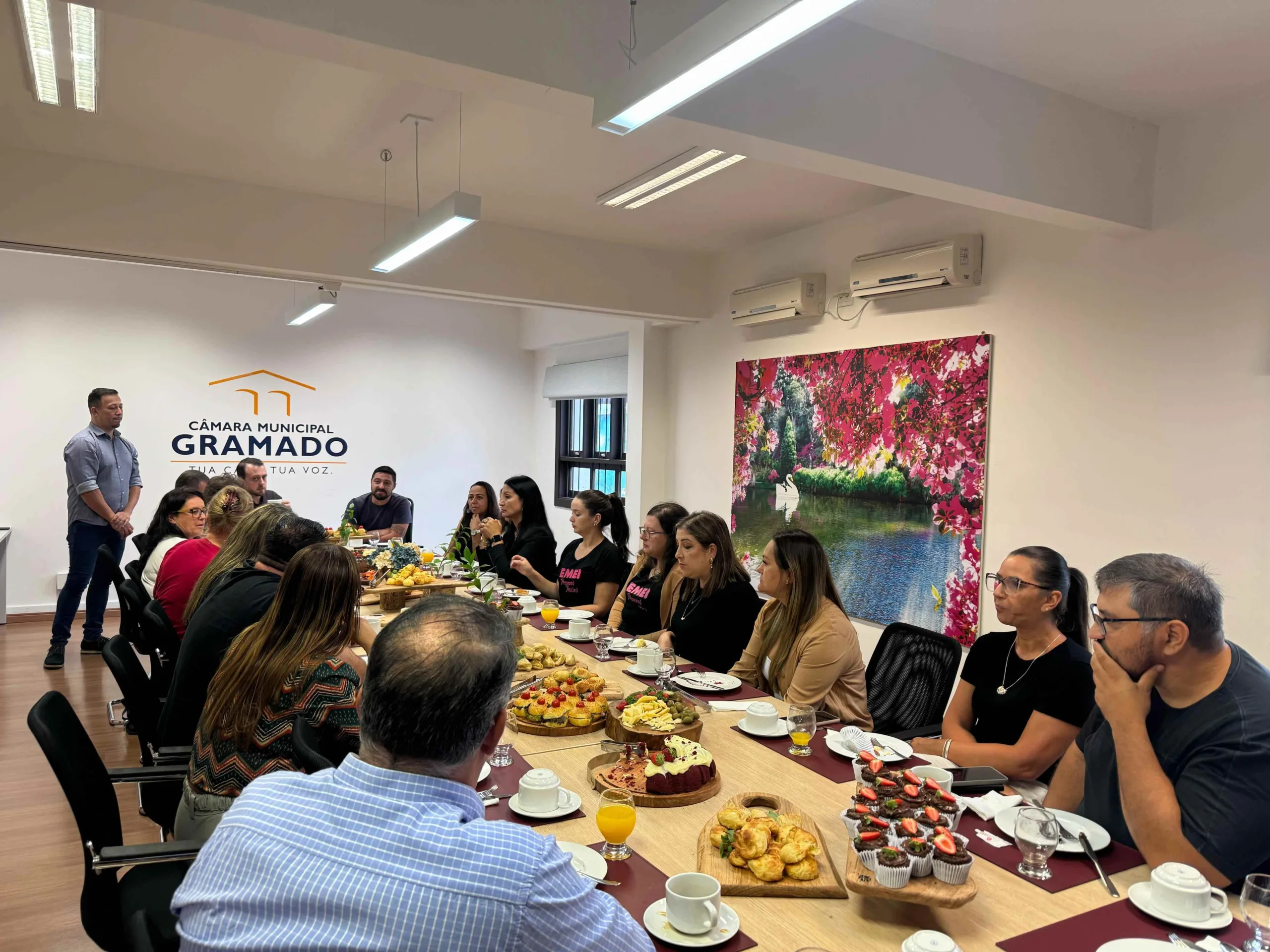Aproximar a comunidade do Poder Legislativo para que a população conheça o trabalho dos vereadores e da Casa de Leis, além de reforçar a importância da parceria entre os poderes Executivo e Legislativo na construção e consolidação da cidade, são princípios que a atual Mesa Diretora da Câmara Municipal de Gramado tem adotado nesta nova legislatura. Com esse objetivo, na quarta-feira, dia 12, os vereadores receberam diretores de escolas infantis e estaduais do município para mais uma edição do “Café com Diretor”.