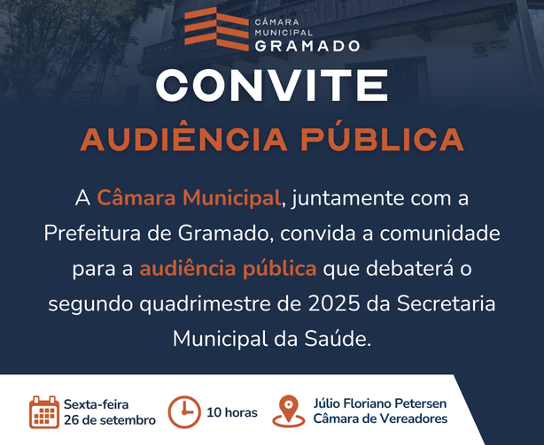 A Câmara Municipal de Gramado, em parceria com a Prefeitura, por meio da Secretaria da Saúde, realizará nesta sexta-feira, dia 26, às 10h, no Plenário Júlio Floriano Petersen, uma audiência pública para apresentar as ações e investimentos da pasta, com base no relatório detalhado do quadrimestre anterior, que abrange os meses de maio, junho, julho e agosto.
