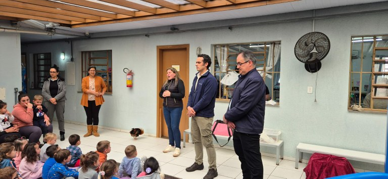 Na tarde de terça-feira, dia 7, os parlamentares, acompanhados do médico veterinário Dr. Renan Stadler, estiveram na Escola Municipal Presidente Vargas, onde realizaram uma conversa educativa e descontraída com os alunos. O encontro abordou temas como a vacinação, a prevenção de zoonoses, o combate aos maus-tratos e ao abandono, além de reforçar a importância da adoção responsável como um gesto de amor e respeito aos animais.