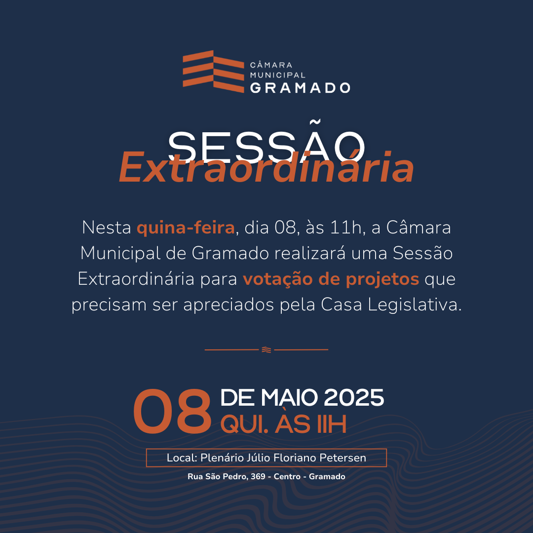 Para dar agilidade e continuidade aos projetos que impactam diretamente a vida de muitos gramadenses, a Câmara Municipal de Gramado realizará, nesta quinta-feira (08), às 11h, uma sessão extraordinária destinada à votação de matérias em tramitação na Casa.