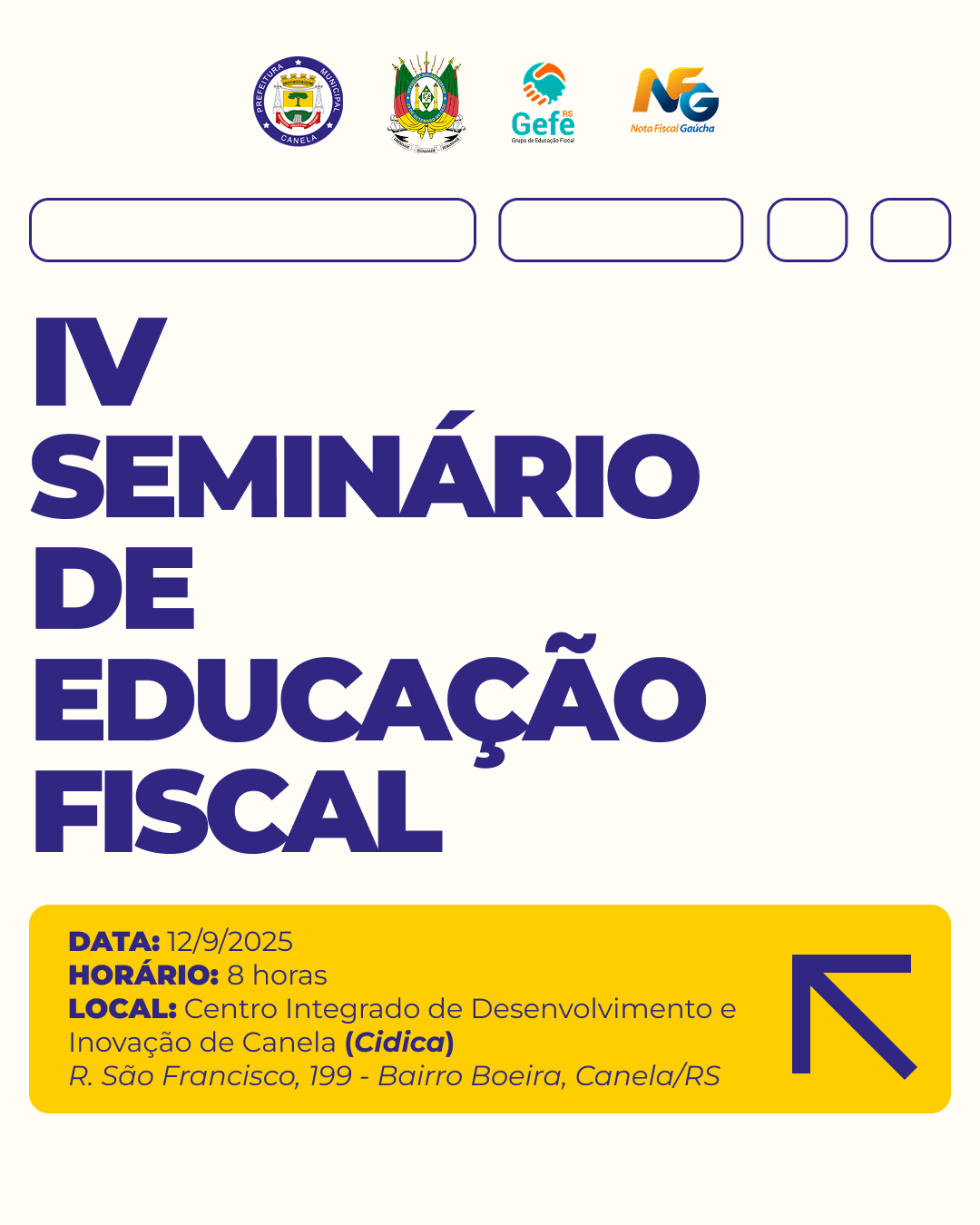 Para promover, premiar e institucionalizar a educação fiscal como instrumento para conquista da cidadania, a Prefeitura de Canela promove no dia 12 de setembro o IV Seminário de Educação Fiscal. O evento será realizado no Dia Municipal da Educação Fiscal, previsto pela Lei nº3.972/2017, quando os setores público e privado são convidados a divulgar a educação fiscal com ações para a comunidade. A atividade acontecerá no Centro Integrado de Desenvolvimento e Inovação (Cidica), a partir das 8 horas.