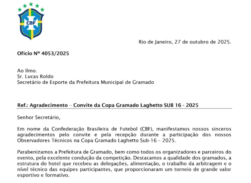 A Confederação Brasileira de Futebol (CBF) enviou um ofício de agradecimento à Secretaria de Esporte e Lazer de Gramado, reconhecendo a excelência da Copa Gramado Laghetto Sub-16 – 2025, realizada recentemente no município. No documento, assinado por Claudio Ibraim Vaz Leal (Branco), coordenador de futebol de base da CBF, a entidade parabeniza a Prefeitura de Gramado, os organizadores e parceiros do evento “pela excelente condução da competição”.