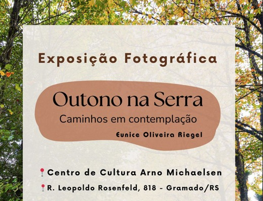 A fotógrafa Eunice Oliveira Riegel apresenta a exposição Outono na Serra – Caminhos em Contemplação, no Centro Municipal de Cultura de Gramado, de 5 a 30 de maio de 2025. A mostra reúne imagens que celebram a beleza e a poesia do outono na Serra Gaúcha, com cenas que transitam entre os caminhos dourados, folhas caídas e paisagens de Gramado e São Francisco de Paula.