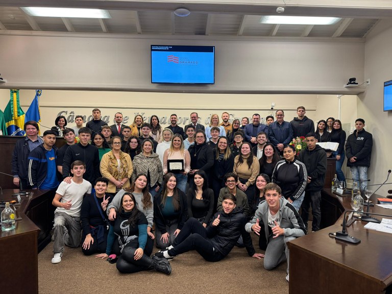 A diretora da escola, Luana Borges, representou a comunidade escolar na tribuna da Câmara: “É uma honra estar aqui em nome do nosso querido colégio. Agradeço ao Pedro, à Denise e a todos os vereadores por reconhecerem a potência do Santos Dumont. Esta homenagem valoriza a nossa missão de promover cidadania, inclusão e protagonismo estudantil. Somos uma escola que respeita a diversidade, que forma cidadãos críticos e que constrói, todos os dias, um futuro mais justo para Gramado.”