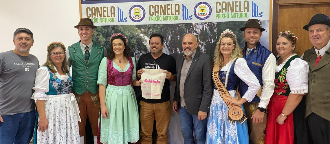 Nessa terça-feira (2), a comitiva da tradicional Festa Kerb de Estância Velha fez uma visita especial à Prefeitura de Canela. O objetivo principal da visita foi estender um convite oficial ao secretário Geral de Governo Jonas Roberto Bohm Bernando e ao secretário de Turismo e Cultura Gilmar Ferreira para participarem da 41° edição deste evento cultural e religioso de grande relevância para a região.