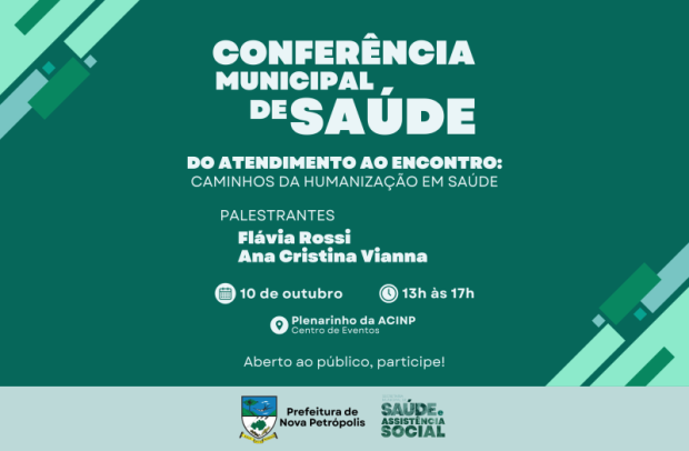 A Conferência Municipal de Saúde de Nova Petrópolis acontecerá nesta sexta-feira, 10 de outubro, no Plenarinho da Acinp, localizado no Centro de Eventos do Município. A conferência ocorre das 13h às 17h e é aberta à toda comunidade. Em função do evento, as Unidades Básicas de Saúde, CRAS, CREAS e CAPS de Nova Petrópolis funcionarão somente até às 12h, não havendo atendimento à tarde no dia 10 de outubro.