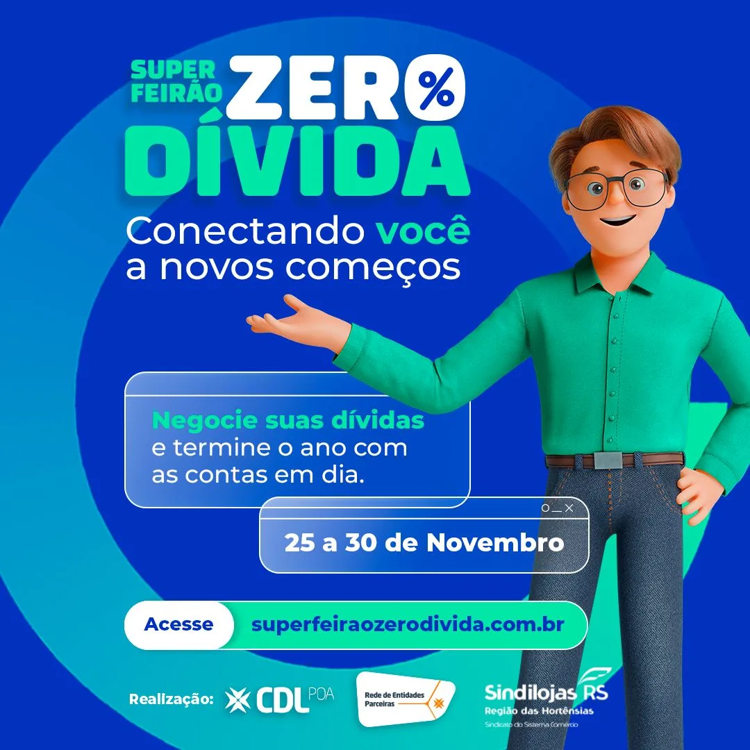 Quitar dívidas e buscar um 2025 mais tranquilo financeiramente é o foco do Super Feirão Zero Dívida, promovido pelo Sindilojas Região das Hortênsias e Rede de Entidades Parceiras. A Campanha acontece de 25 a 30 de novembro, em formato 100% digital, facilitando o contato entre consumidores e empresas de qualquer local do Rio Grande do Sul.
