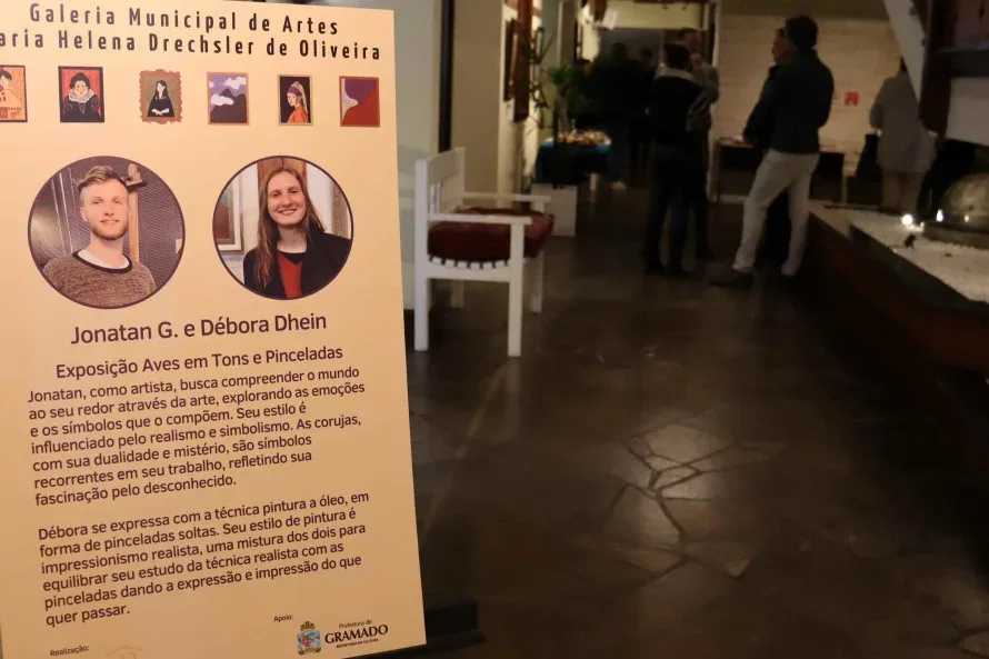 Um coquetel oferecido pelos artistas Jonatan G. e Débora Dhein ocorreu na noite desta quarta-feira na Galeria Municipal de Artes Maria Helena Dreschler de Oliveira, localizada no saguão da Câmara de Vereadores de Gramado. O evento marcou a abertura da exposição “Aves em Tons de Pinceladas” e foi prestigiado por amigos e familiares dos irmãos, além de artistas da cidade, o secretário municipal da Cultura, Ricardo Reginato, vereadores e comunidade em geral.