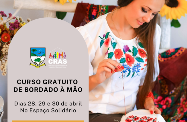 O CRAS (Centro de Referência de Assistência Social) de Nova Petrópolis promove o curso profissionalizante do SENAR (Serviço Nacional de Aprendizagem Rural) nos dias 28, 29 e 30 de abril, no Espaço Solidário. O curso de Bordado à Mão é totalmente gratuito e terá emissão de certificado de conclusão.