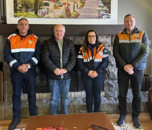 Nesta terça-feira (01), a Defesa Civil de Gramado recebeu a visita técnica do Coordenador Regional Major Souza e do Adjunto Tenente Bassan, representantes da Coordenadoria Regional de Proteção e Defesa Civil de Caxias do Sul (CREPDEC 9). A comitiva foi recepcionada pela coordenadora da Defesa Civil de Gramado, Juliana Fisch, e sua equipe, na sede do órgão, e também pelo vice-prefeito Luia Barbacovi, na Prefeitura.