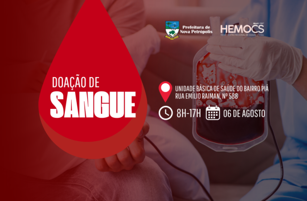 o dia 06 de agosto, das 8h às 17h, acontece a ação de coleta de sangue em Nova Petrópolis, promovida pelo Hemocentro Regional de Caxias do Sul (HEMOCS). Doadores interessados em participar já podem realizar agendamento com a Secretaria de Saúde e Assistência Social pelo telefone (54) 3298-2650, ou com a sua UBS de referência. A coleta acontece na UBS do Bairro do Piá, na Rua Emílio Raiman, n° 588. Todas as doações são destinadas ao Hemocentro.