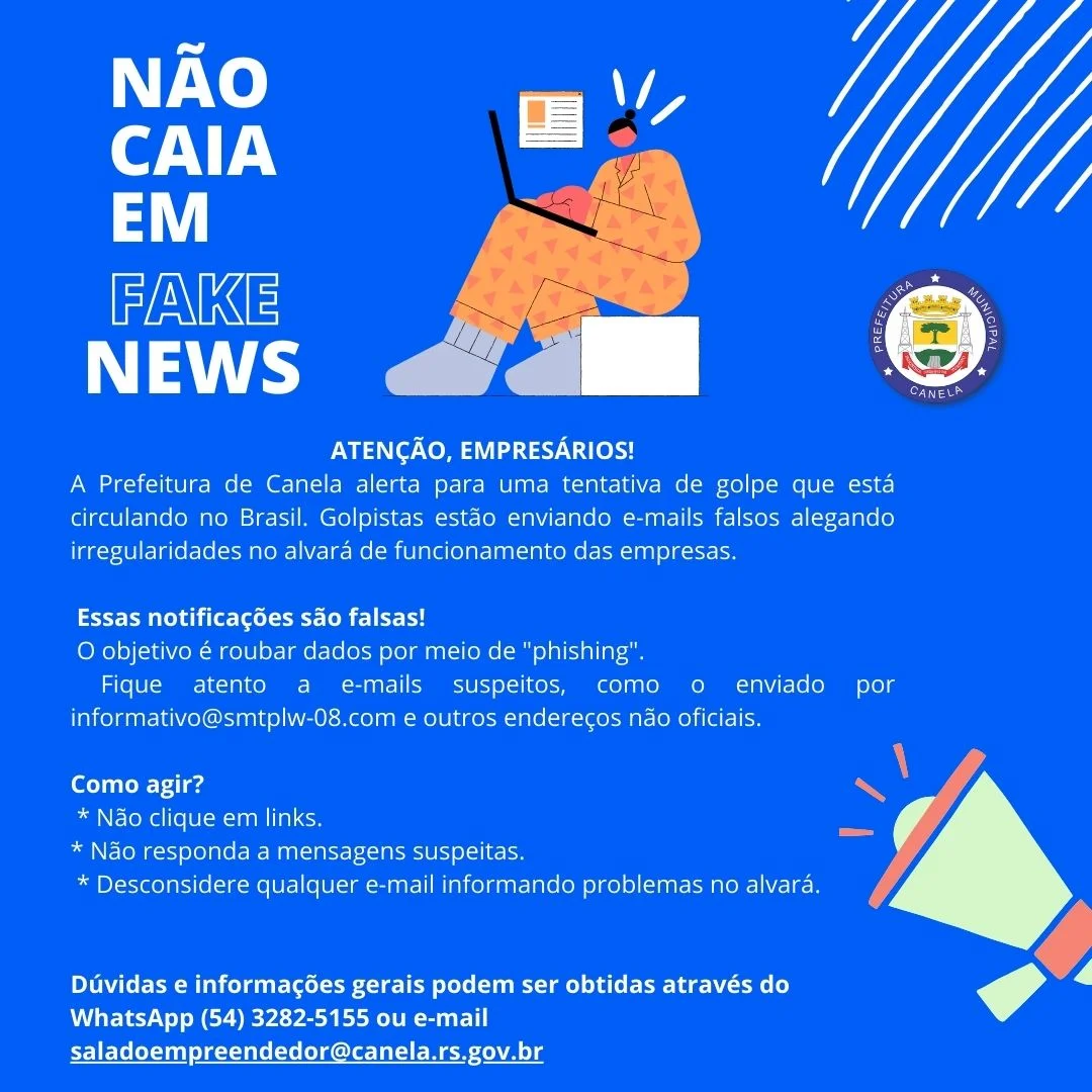 A Prefeitura de Canela, por meio da Secretaria da Fazenda e Desenvolvimento Econômico, Cidica e Sala do Empreendedor alerta a população sobre uma tentativa de golpe em nome da Administração Municipal que está sendo enviada via e-mail para proprietários de estabelecimentos comerciais, intimando os responsáveis sobre supostas irregularidades. É falso!