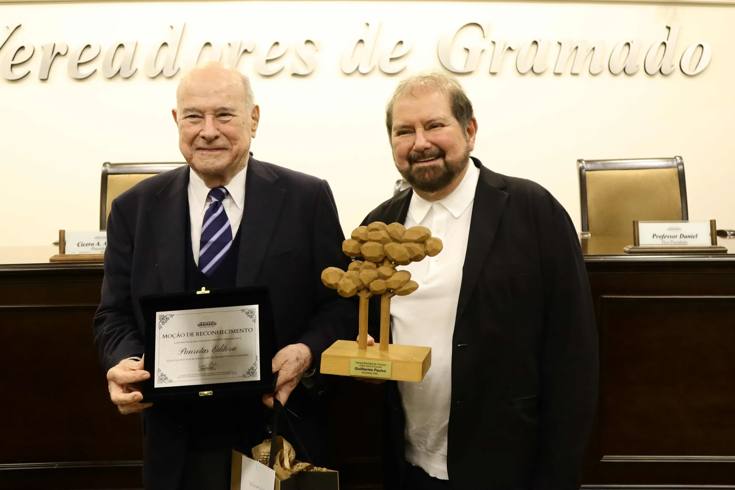 A Câmara de Vereadores de Gramado realizou mais uma noite festiva na noite desta quarta-feira, dia 6, realizando a entrega do tradicional troféu Silvia Zorzanello e também Moção de Reconhecimento. As homenagens foram entregues, respectivamente, ao empresário Guilherme Paulus, e à Editora Panrotas pelos seus 50 anos de atuação.