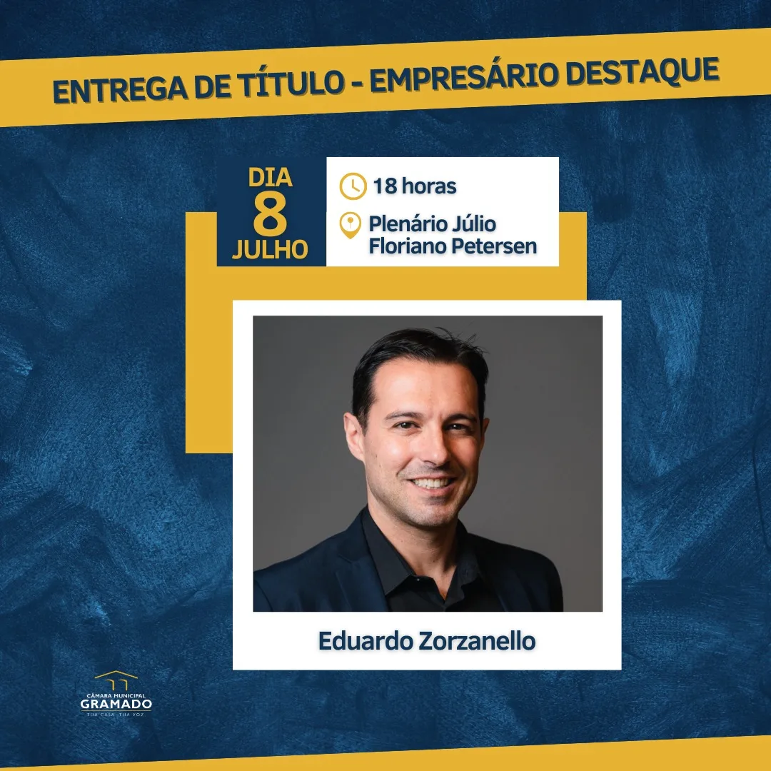 A Câmara de Vereadores de Gramado realizará a entrega do título de Empresário Destaque no início da sessão ordinária do próximo dia 8 de julho. O homenageado deste ano é Eduardo Zorzanello. A homenagem seria entregue originalmente durante a 13ª Semana Legislativa, na sessão solene que ocorreu dia 26 de junho, mas, devido à agenda do agraciado, que faz questão de receber a distinção pessoalmente, terá o momento de entrega na próxima segunda-feira.