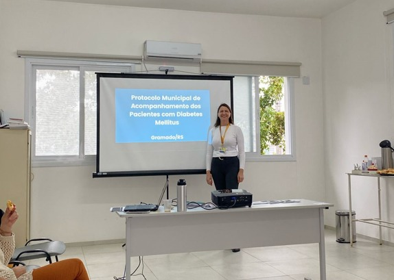 Nesta quinta-feira (13), enfermeiros do Município de Gramado participaram de um treinamento para a implantação do Protocolo Municipal de Acompanhamento Multiprofissional ao Paciente com Diabetes. A capacitação foi ministrada pela farmacêutica Franciele Barbara Malacarne, com o objetivo de alinhar os novos fluxos de atendimento e aprimorar o cuidado com estes pacientes.