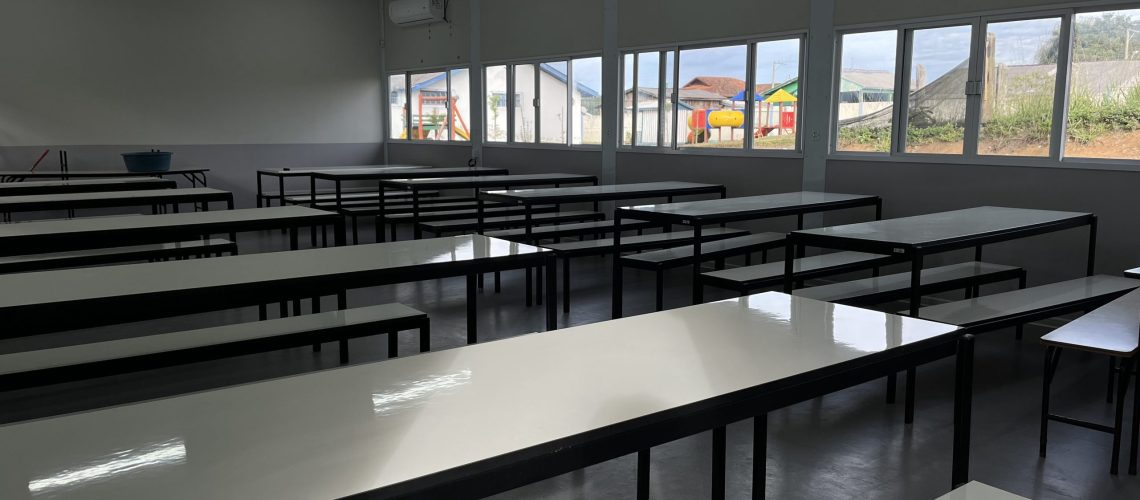Anteriormente, o espaço do refeitório comportava apenas três mesas, o que limitava o número de alunos que podiam ser atendidos simultaneamente. Com as recentes melhorias, o local agora tem capacidade para atender até 120 alunos ao mesmo tempo, oferecendo assim uma experiência mais confortável e eficiente durante as refeições.