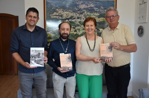 Helena também presenteou o prefeito, vice e secretário com exemplares de sua autoria, ‘Nossas Mães e os Sinos de Bochum’ (2023), livro que resgata o nome das 16 mulheres pioneiras do Tannenwald (hoje, Pinhal Alto), antes anônimas. O livro também é uma reparação, uma vez que mostra a história de 30 mulheres descendentes da imigração, contadas por filhos octogenários e nonagenários, escancarando usos, costumes e tradições que são representativos e pertinentes a todo Estado.