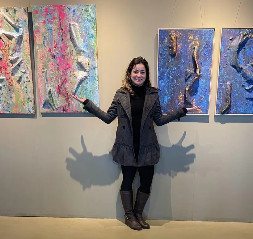 A mostra apresenta 10 quadros com volumes e texturas grandes que “saltam da tela” e convidam o espectador a interagir com eles, tocando e sentindo a arte, além do contato visual.