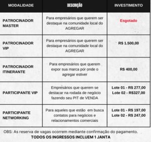 A programação inclui abertura, painéis de realizadores e patrocinadores, pitches de venda, dinâmica de networking e jantar na Churrascaria Garfo e Bombacha.
