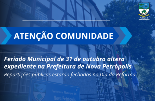 Não haverá expediente na Prefeitura de Nova Petrópolis, Secretarias Municipais e demais órgãos públicos Municipais no dia 31 de outubro, sexta-feira, conforme Lei Municipal nº 317, de 24 de julho de 1967. Nesta data, comemora-se o Dia da Reforma e é Feriado Municipal em Nova Petrópolis.