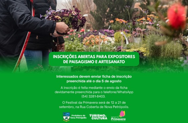 A Secretaria Municipal de Turismo e Cultura informa que as inscrições de expositores – paisagismo e artesanato – para o Festival da Primavera 2025 estão abertas e devem ser realizadas até o dia 5 de agosto. A inscrição é feita mediante o envio da ficha devidamente preenchida para o telefone/WhatsApp (54) 3281-8403. O pagamento da taxa deverá ser feito após aprovação da ficha de inscrição, quando serão enviados os dados para depósito. O Festival da Primavera será realizado de 12 a 21 de setembro, na Rua Coberta de Nova Petrópolis.