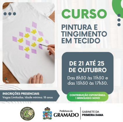 O Gabinete da Primeira-Dama Jandira Tissot, em parceria com as Damas de Caridade, abriu inscrições para dois cursos gratuitos e abertos à comunidade. De 21/10 até 25/10 acontece o Curso de Pintura e Tingimento em Tecido. As aulas acontecerão das 8h30 às 11h30 e das 13h30 às 17h30.