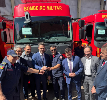 Gramado foi uma das cidades contempladas pelo Governo do Estado para receber um novo veículo para o Corpo de Bombeiros. A solenidade de entrega das 36 viaturas foi realizada na última sexta-feira (6), em Canoas, contando com a participação do governador Eduardo Leite. Estiveram presentes no ato o secretário de Trânsito do município, Tiago Procópio e o comandante da corporação em Gramado, capitão Pedro Henrique Costa Sanhudo, que receberam as chaves do caminhão autobomba tanque diretamente das mãos do governador.