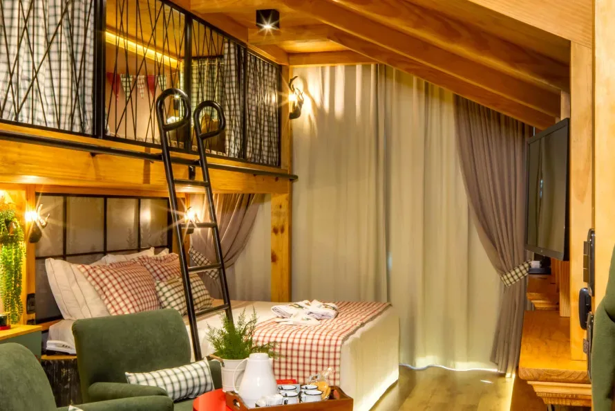 O “Quarto do Alceu e da Lola” tem, logo na entrada, o capacho e a sinalização na porta que indicam que é o quarto deles, com folheteria personalizada, assim como o cartão-chave para abrir a porta. No espaço, as crianças vão encontrar os itens pessoais dos personagens como escova de dentes, chapéu, mantinha etc, além do enxoval (roupa de cama e toalhas) personalizado. Os apartamentos de 25m2 acomodam confortavelmente dois adultos e duas crianças e contam com todo o conforto e excelência característicos do Alpestre: frigobar (com itens 100% cortesia no primeiro dia), Smart TV, Wifi gratuito, calefação, ar-condicionado, secador de cabelo, cofre e amenities para toda a família. A decoração do quarto é inspirada nas cabanas aconchegantes do Polo Norte, trazendo o clima mágico dos aposentos do Papai Noel.
