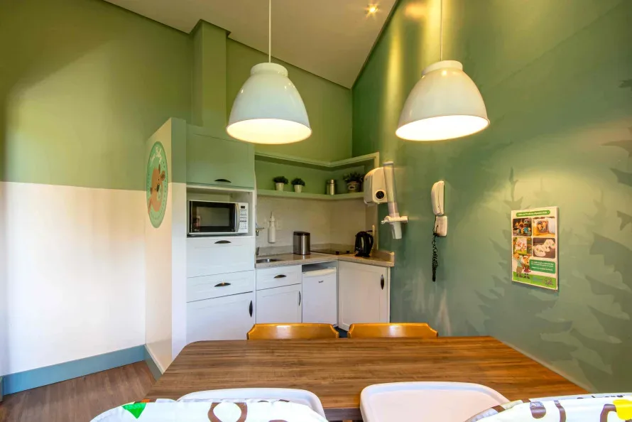 Além disso, na área comum, o hotel possui uma copa-baby, equipado com fogão, louça, talheres, jarra elétrica, microondas, mesa e cadeirões para os pais aquecerem e prepararem papinhas e mamadeiras.