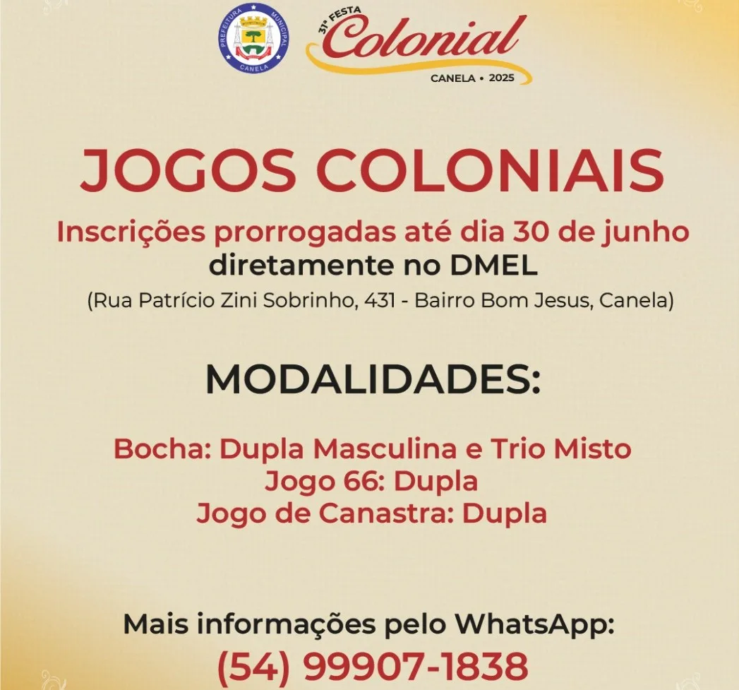 As inscrições para os Jogos Coloniais da 31ª Festa Colonial de Canela foram prorrogadas até o dia 30 de junho. Conforme o Departamento Municipal de Esporte e Lazer (DMEL), até o momento já foram recebidas as seguintes inscrições: 12 duplas de bocha; três trios de bocha; 12 duplas de canastra e três duplas de 66. Somente as inscrições para as duplas de bocha são limitadas com 20 vagas. No trio de bocha, é obrigatória a participação de, pelo menos, uma mulher.