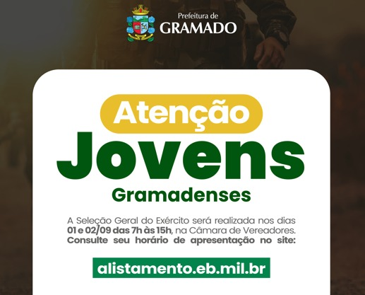 Atenção, jovens de Gramado que completam 18 anos em 2025 e realizaram o alistamento militar! A Seleção Geral do Exército está chegando. Fique atento às datas e local para não perder a sua vez.