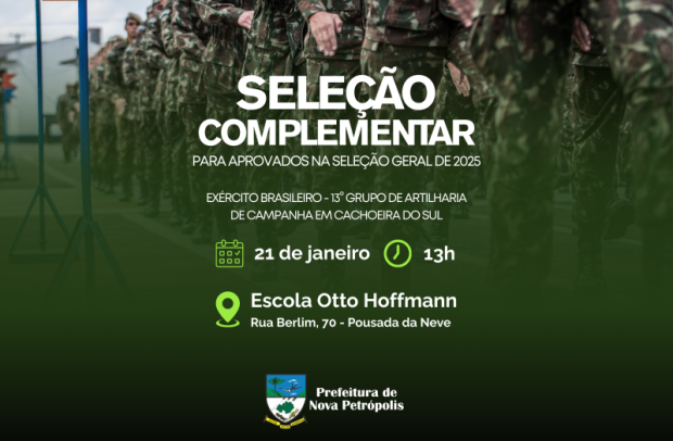 No dia 21 de janeiro, quarta-feira, às 13h, na Escola Municipal de Ensino Fundamental Otto Hoffmann (Rua Berlim, nº 70, Pousada da Neve), ocorre a etapa final de avaliação para jovens designados após o alistamento militar de 2025. Nessa etapa, os jovens passarão por uma entrevista, avaliação física e inspeção médica e odontológica.